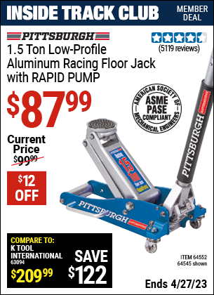 Inside Track Club members can buy the PITTSBURGH 1.5 Ton Aluminum Rapid Pump Racing Floor Jack (Item 64545) for $87.99, valid through April 27, 2023.