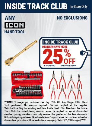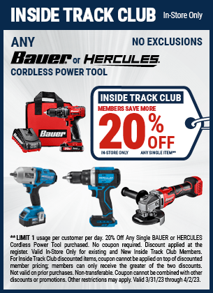 Harbor Freight’s Inside Track Club members get access to Exclusive Pricing on new items monthly. Look for the blue tags and get ITC Member Savings – no coupons required! Join Inside Track Club today to save now. Prices valid online or in-store with active Inside Track Club membership. See deal for details.