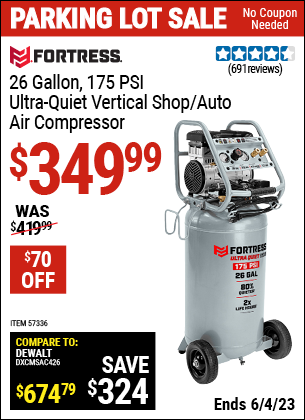 FORTRESS 2 Gallon, 135 PSI Ultra Quiet Oil-Free Hand-Carry Jobsite Air Compressor for $169.99
