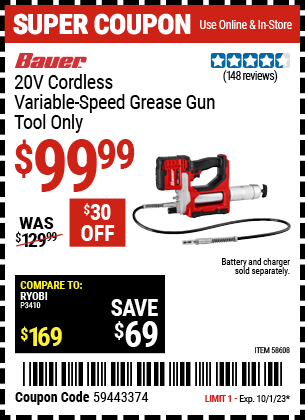 BAUER 20V Cordless Variable Speed Grease Gun – Tool Only for $109.99